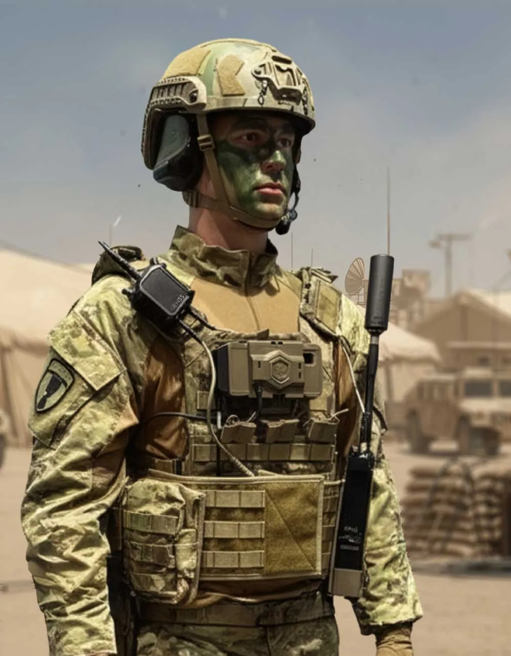 A camouflage-clad soldier stands in a desert forward operating base, equipped with the GENSS Soldier radio mounted centrally on his body armour, with a shoulder-worn control unit and a vertical tactical antenna attached to his vest. Military vehicles and tents are visible in the background.